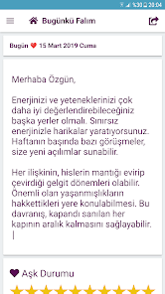 Bugünkü Falım - Günlük Fal is een gebruiksvriendelijke Android-app die gebruikers in staat stelt om hun dagelijkse horoscoop eenvoudig te lezen. Met een strak en overzichtelijk ontwerp is het mogelijk om niet alleen de huidige horoscoop te bekijken, maar ook de horoscopen van de afgelopen 20 dagen te archiveren en opnieuw te lezen. De app biedt ook de mogelijkheid om dagelijkse meldingen in te stellen, zodat gebruikers herinnerd worden aan hun horoscoop zonder dat deze in bulk wordt verzonden.